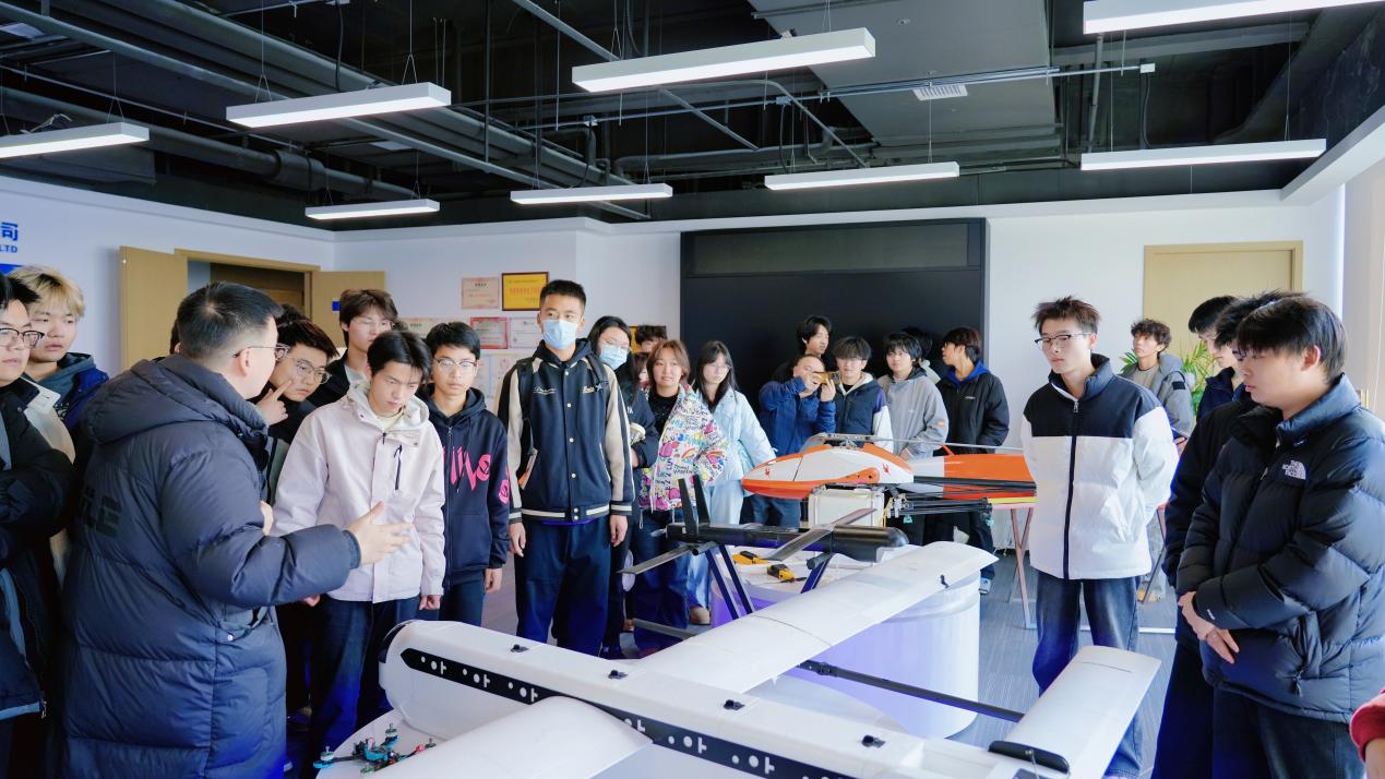 走进基地展厅,图文展板、无人机实物模型与行业应用影像资料全方位呈现了星际无人机的发展历程、核心技术与业务布局。从应急救援现场的空中侦察、地质测绘的精准数据采集,到物流运输的高效配送,无人机技术在多领域的广泛应用场景,让同学们对专业前景有了立体认知,不时驻足询问,展现出强烈的探索欲。